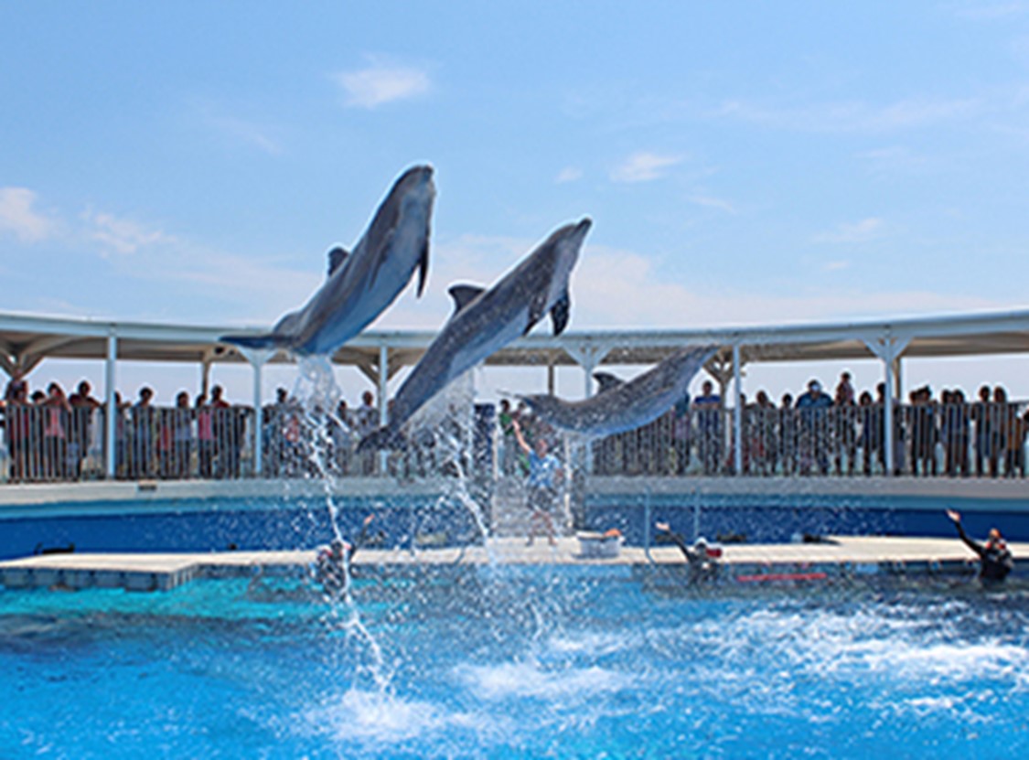 Here is a photo of one of the unique dolphin shows that you can watch with your family at the Gulfarium!